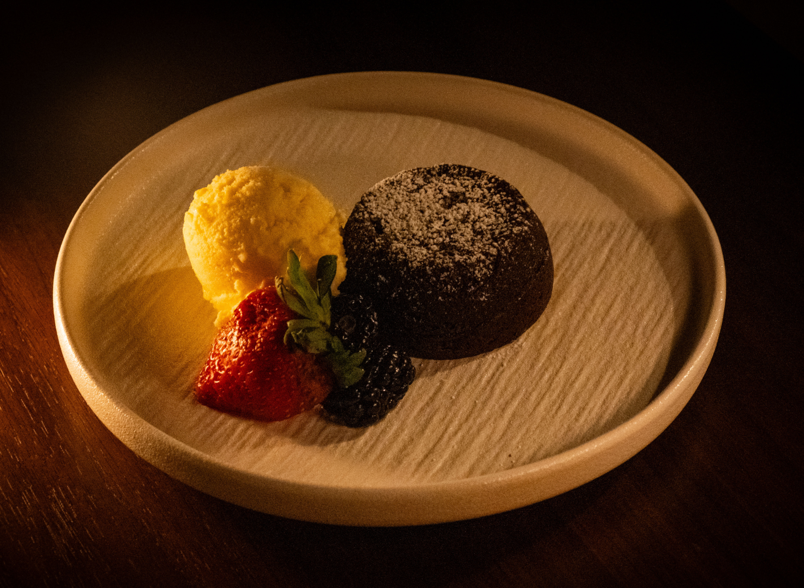 chocolate lava cake, icing sugar, mixed berries, vanilla ice cream
