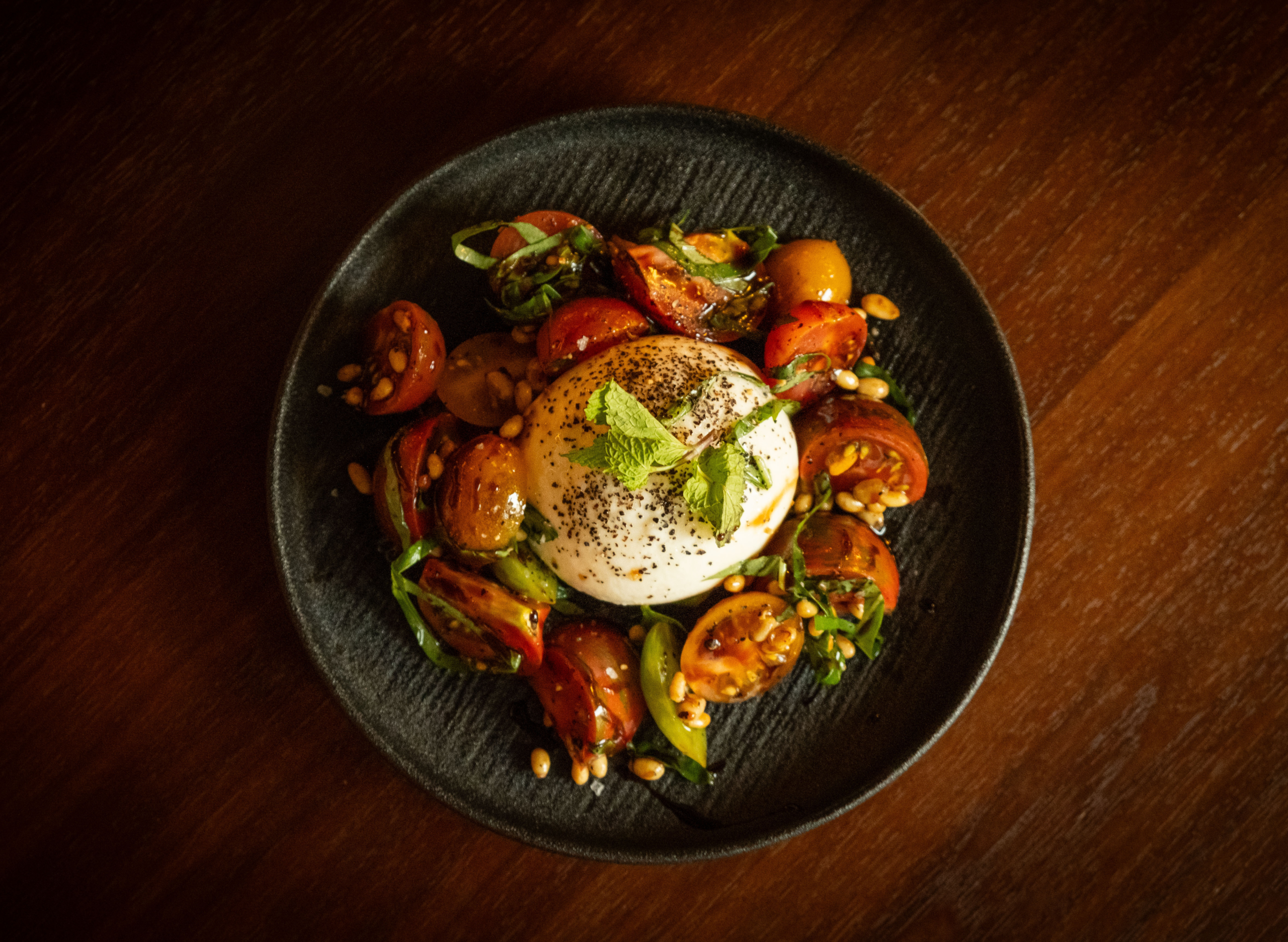 Creamy burrata paired with seasonal tomatoes and basil — a timeless, indulgent starter of freshness and richness.