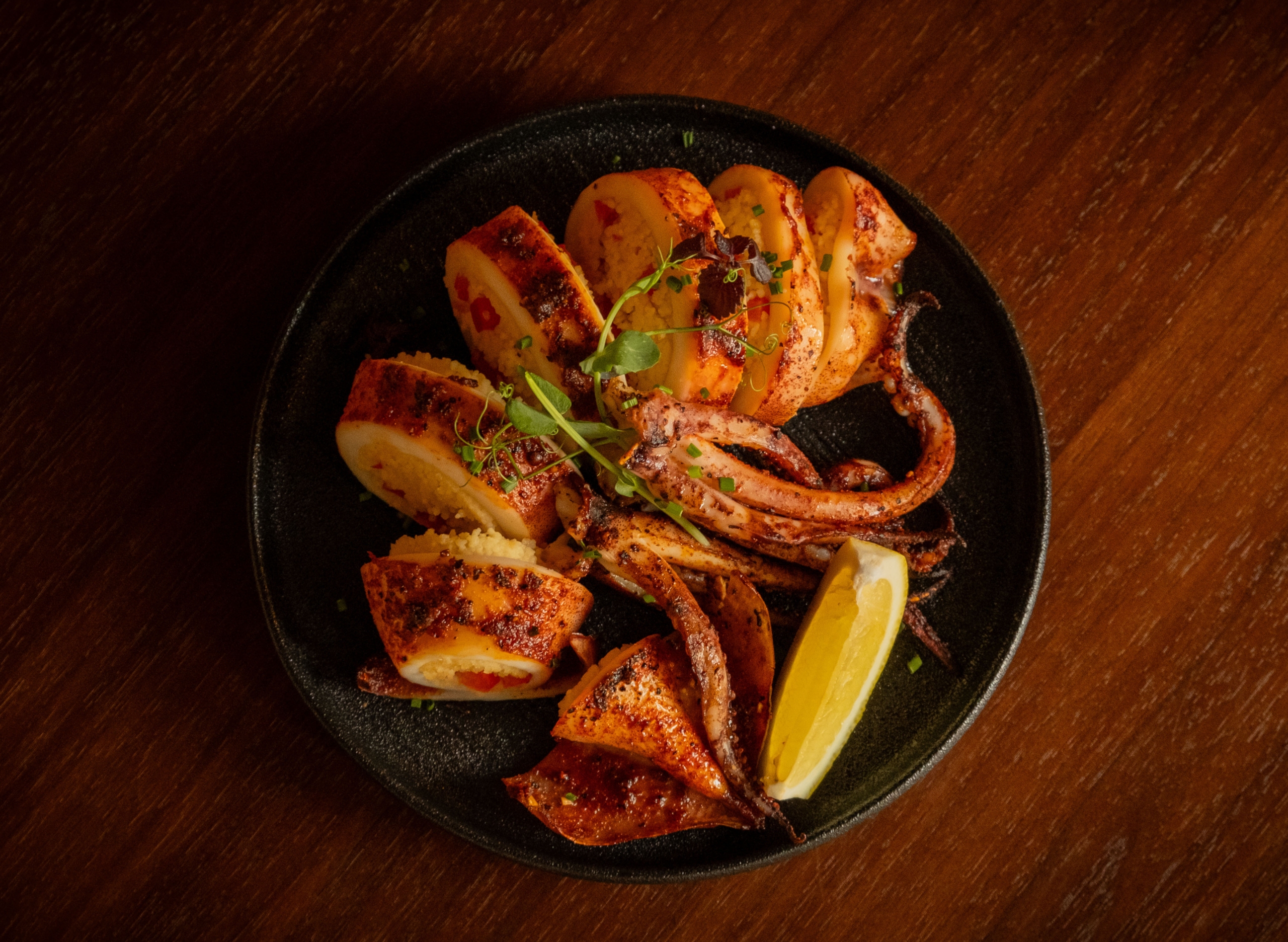 Chargrilled Japanese squid stuffed with mildly spiced couscous— smoky, savoury, and delightfully chewy.